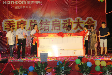 2014年8月15日18:00,宏光照明2014年第三季度總結(jié)啟動大會隆重舉行,宏光照明董事長黃亮竣、副總經(jīng)理黃權(quán)國、營銷副總董小芳、研發(fā)副總姜宏等中高層領(lǐng)導(dǎo)出席。同時蒞臨本次啟動大會的有9家企業(yè)的代表們以及宏光公司全體員工總計350人。